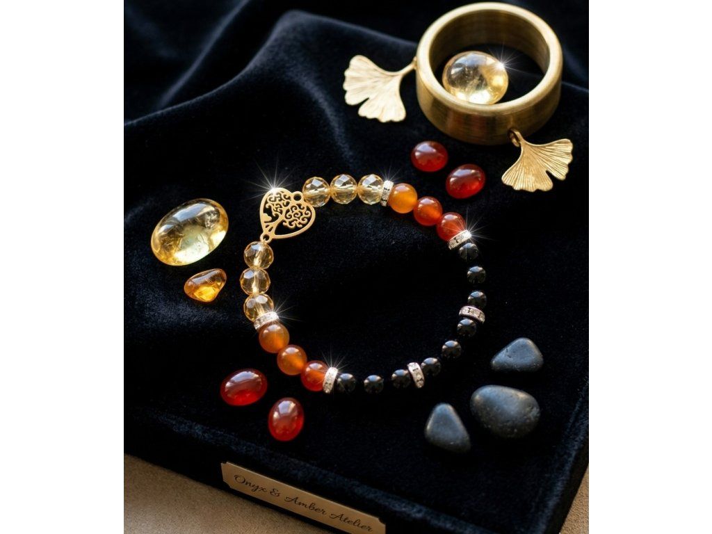 Náramek z karneolu, granátu, onyxu a broušeného zlatého skla působí jako výrazná směs síly, vášně a ochrany.