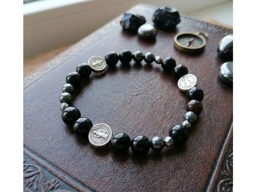 Kombinace temných, mystických minerálů s historicky významným symbolem kříže svatého Benedikta vytváří šperk, který není jen módním doplňkem, ale mocným osobním talismanem.