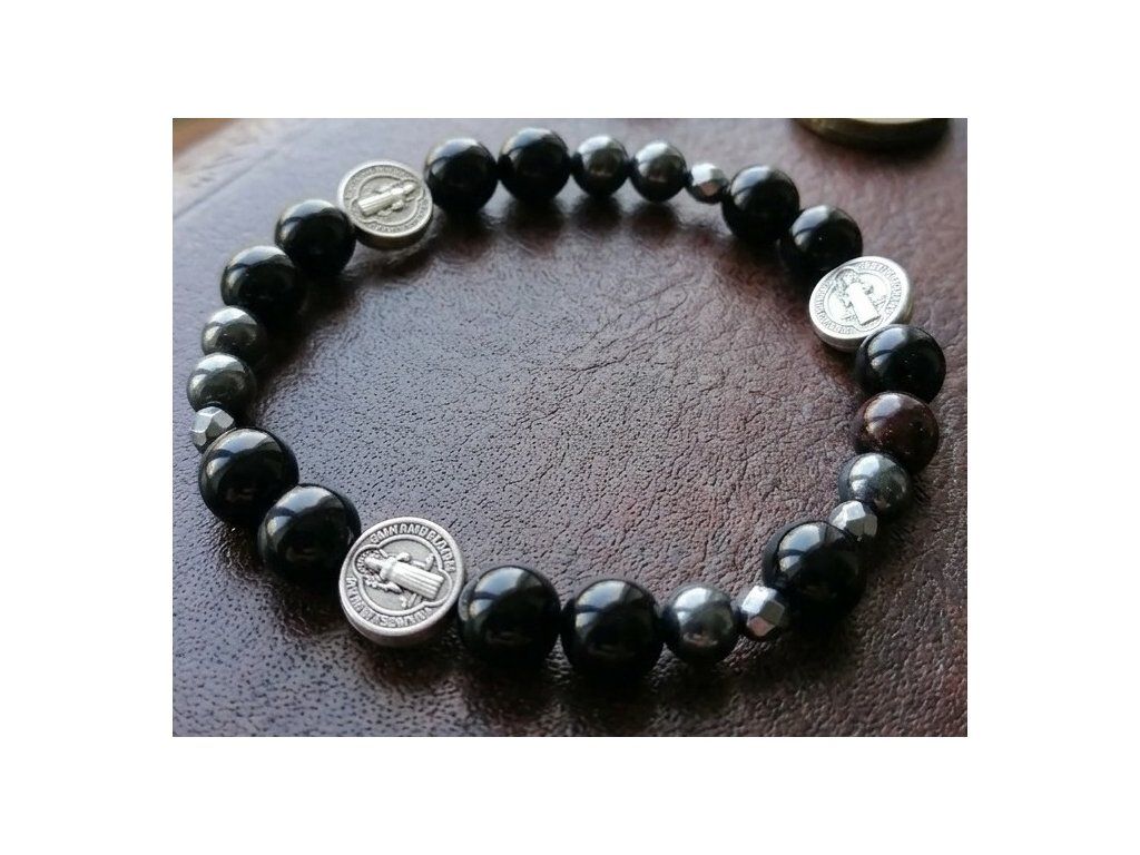 Náramek z hematitu, onyxu a granátu se zapuštěnými třemi přívěsky kříže sv. Benedikta: