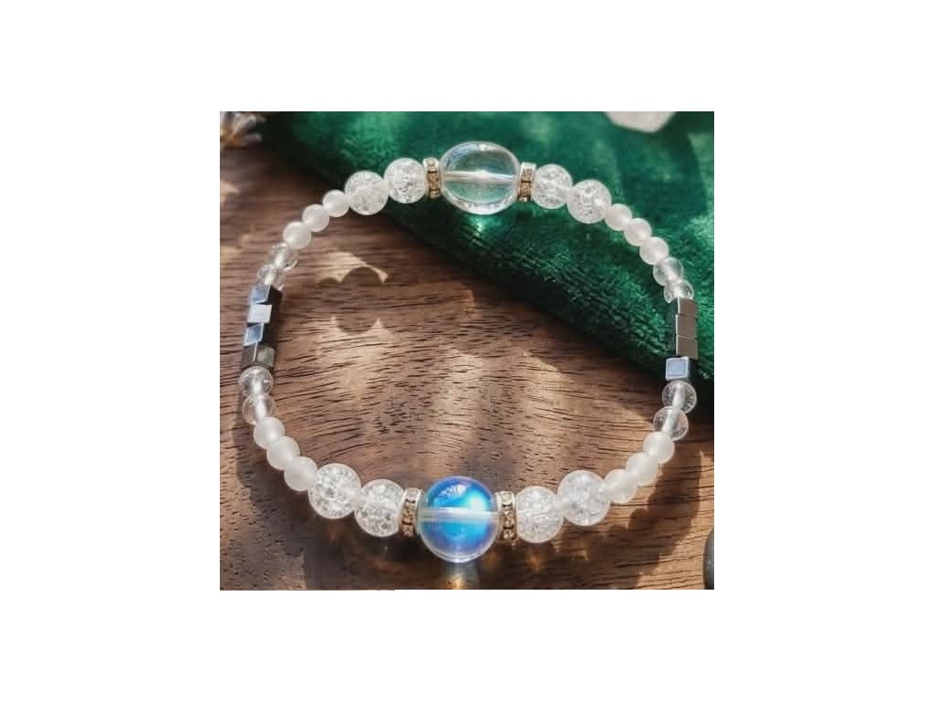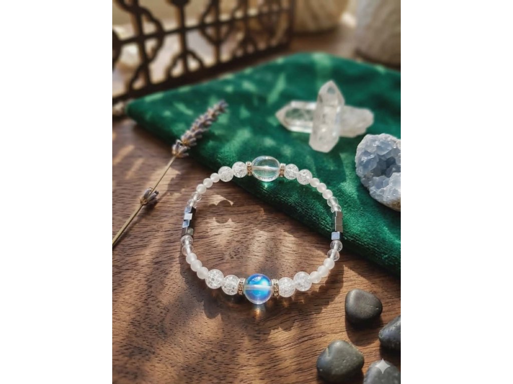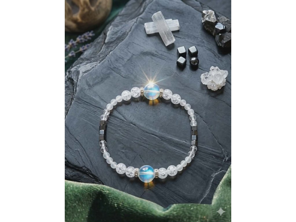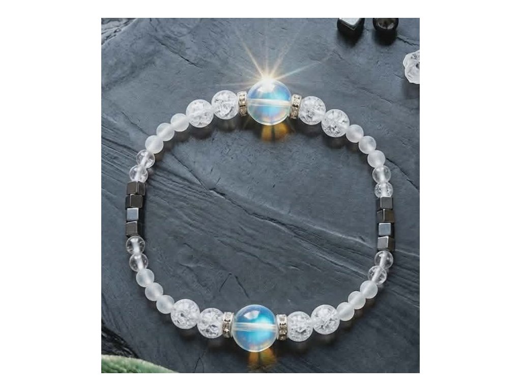 Náramek z minerálů - Vnitřního klidu a intuice: Designový náramek z drahých kamenů Tento šperk není jen doplňkem, je to osobní talisman. Kombinuje v sobě éterickou krásu nebeských odstínů s nekompromisní silou země. Design náramku staví na kontrastu mezi jemným, poloprůsvitným opalitem a měsíčním kamenem, které jsou uzemněny kovovým leskem hematitu a projasněny čistým křišťálem. Detailní pohled na složení
