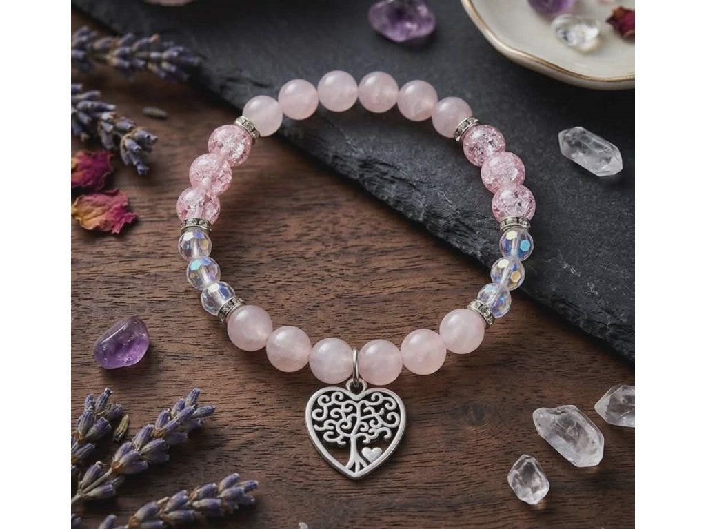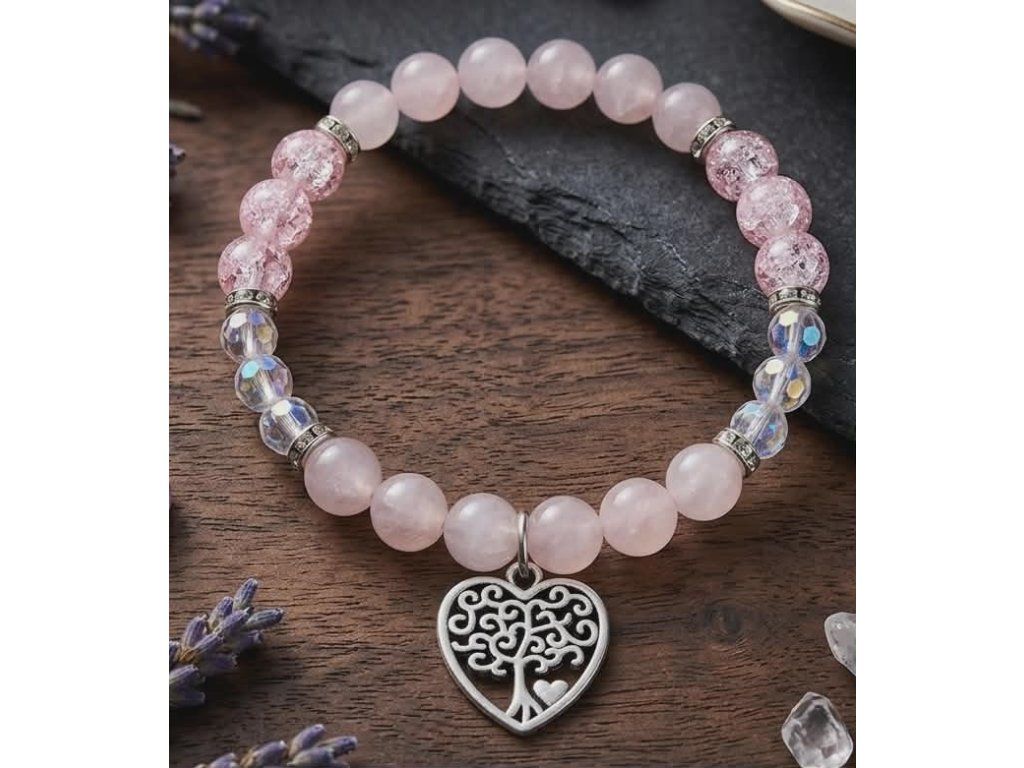 Náramek z růženínu, praskaného křišťálu a broušeného skla s přívěskem Strom života v srdci: