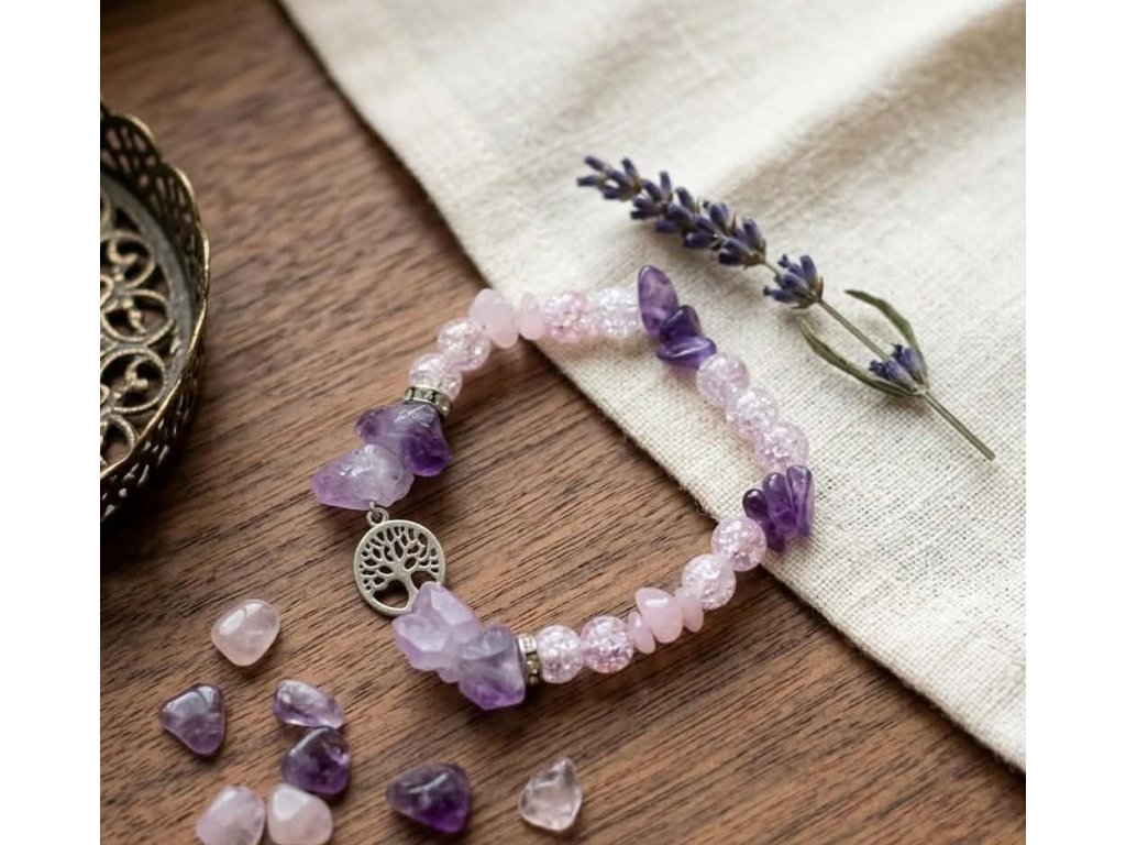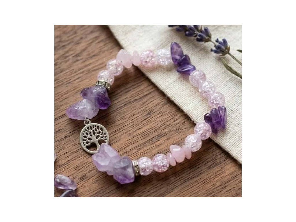 Náramek z surového ametystu, křišťálu a růženínu se stromem života z chirurgické oceli je něžnou kombinací tří harmonických minerálů v jejich přirozené, neupravené kráse.