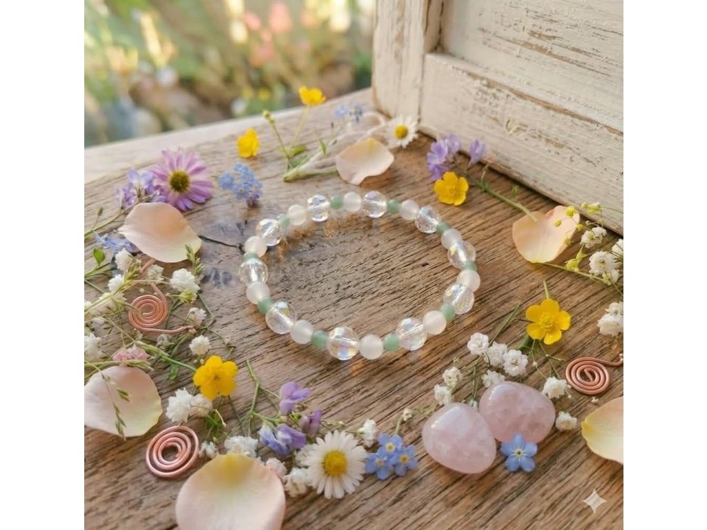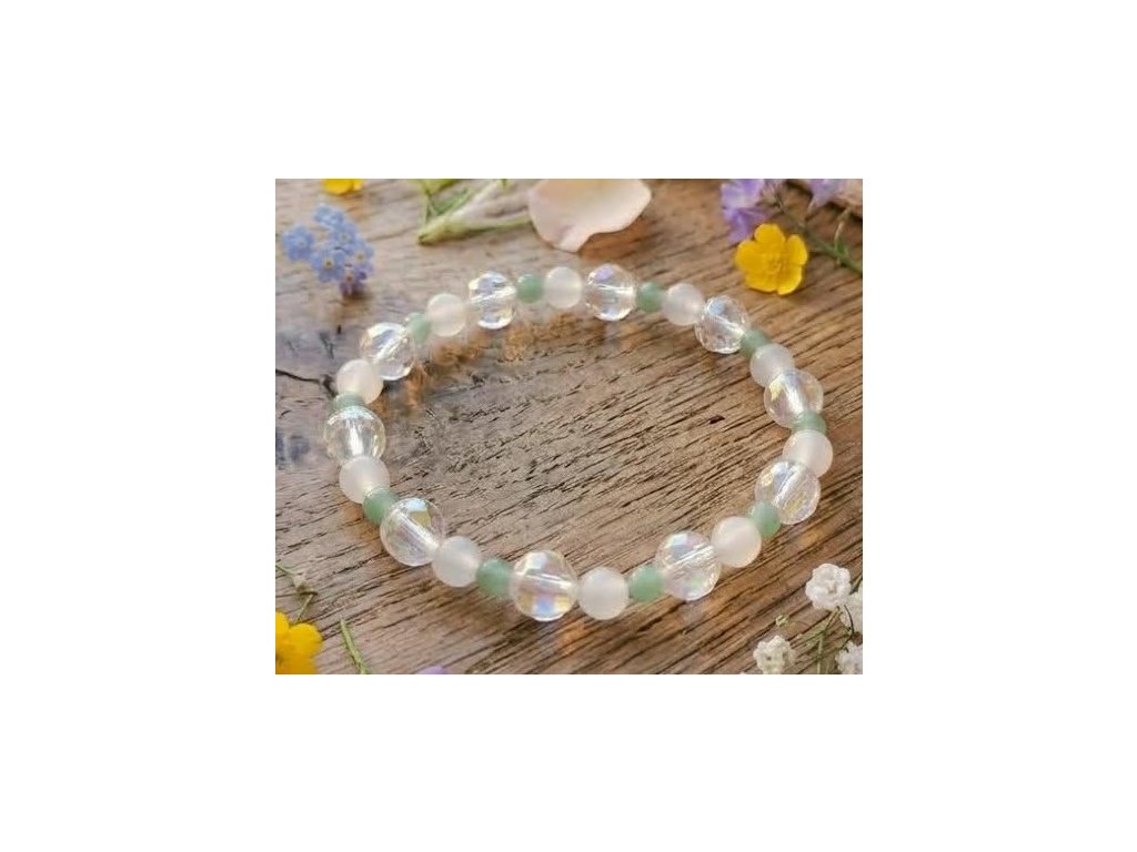 Design a zpracování: Náramek je navržen tak, aby působil lehce a vzdušně. Střídání broušených fazetovaných korálků (andělská aura), které krásně lámou světlo, s hladkými kuličkami (růženín a avanturín) vytváří zajímavou texturu, která vynikne při každém pohybu ruky.