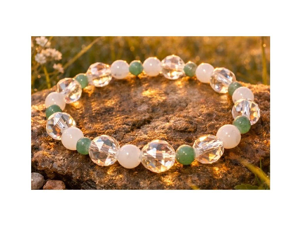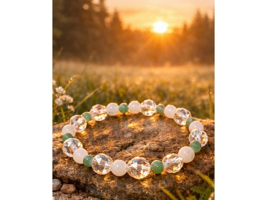 Avanturín zelený: Známý jako "kámen štěstí a příležitostí". Jeho jemně zelená barva uklidňuje emoce, pomáhá při rozhodování a harmonizuje srdeční čakru. Do náramku vnáší prvek stability a růstu.